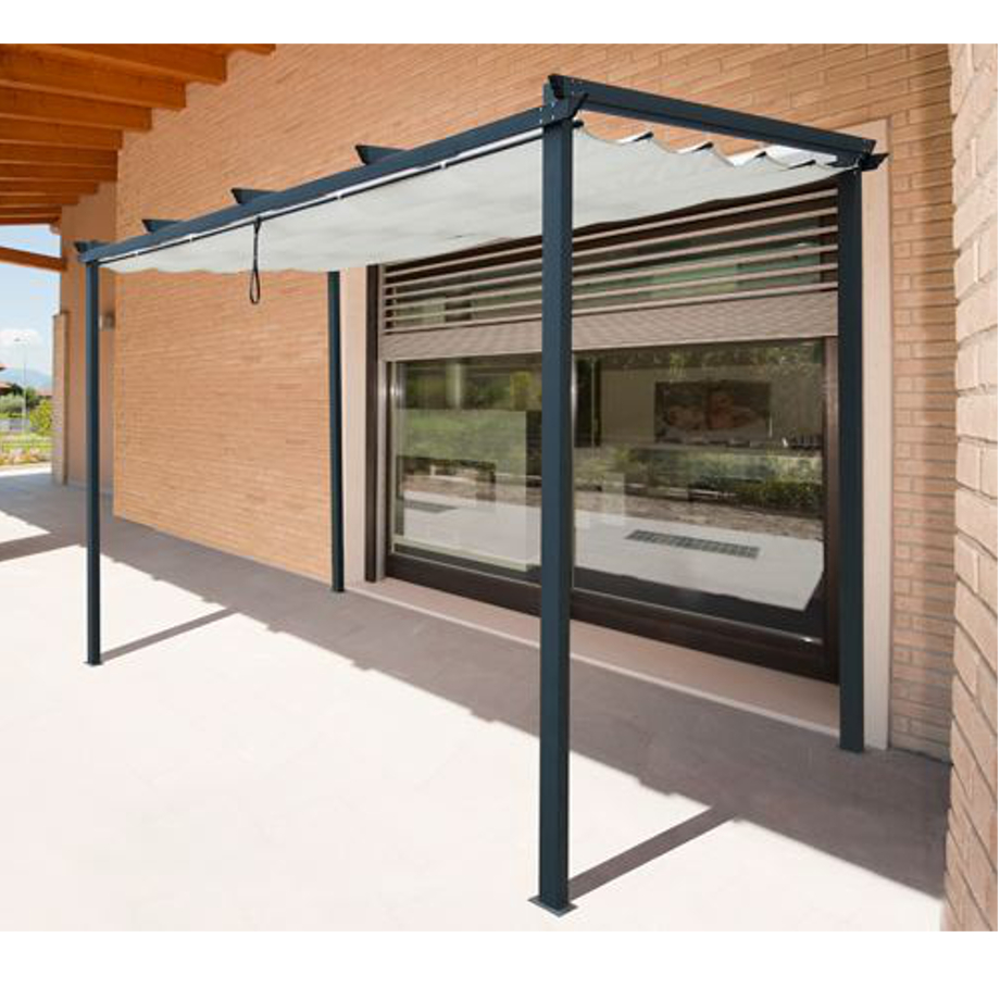 pergola azores con copertura scorrevole in poliestere beige da 260 gr./mq. Il telo scorre con pattini all’interno di binari. La manovra di chiusura e apertura è facilitata da maniglione.