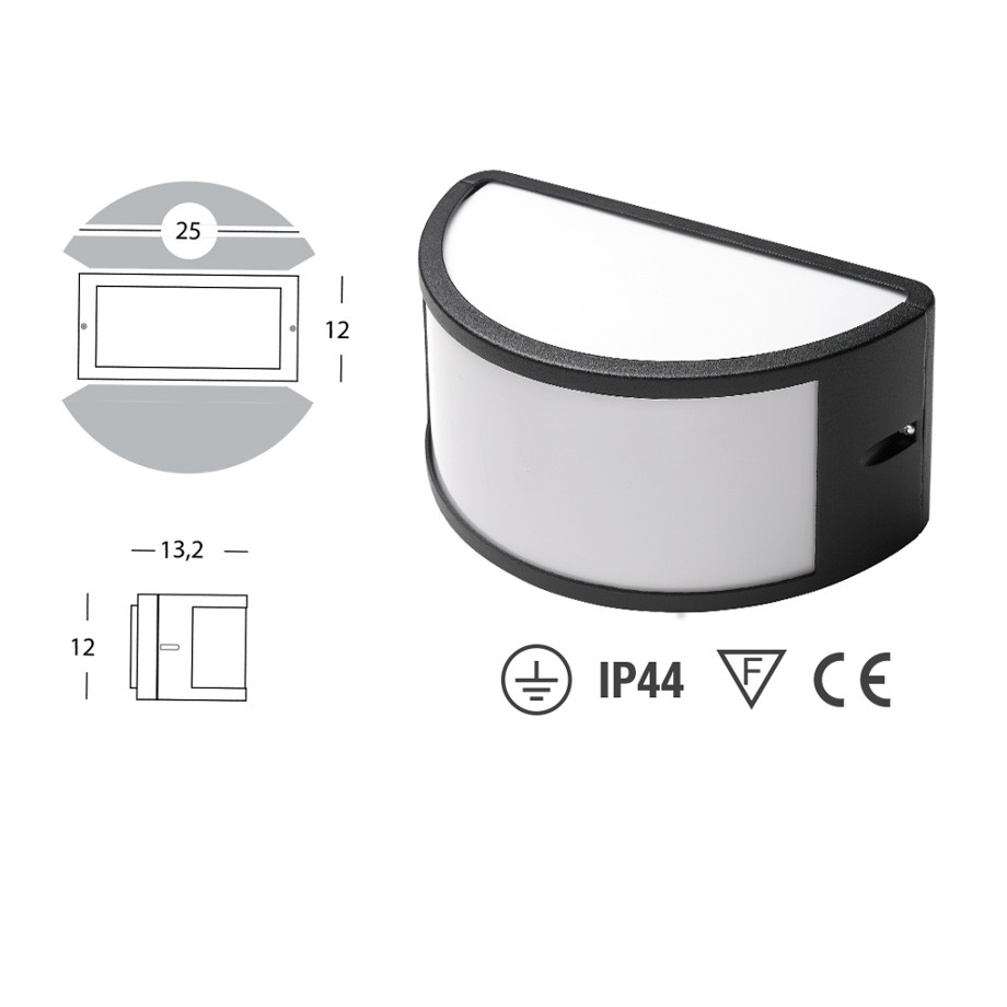Applique a mezzaluna per esterni – Struttura in alluminio pressofuso – Diffusore in policarbonato opalino – Portalampada E27 in porcellana – Accessori per il fissaggio inclusi (lampada esclusa max 60 watt) – IP44 – Dimensioni 25×13,2x12H cm. – Cf. in scatola
