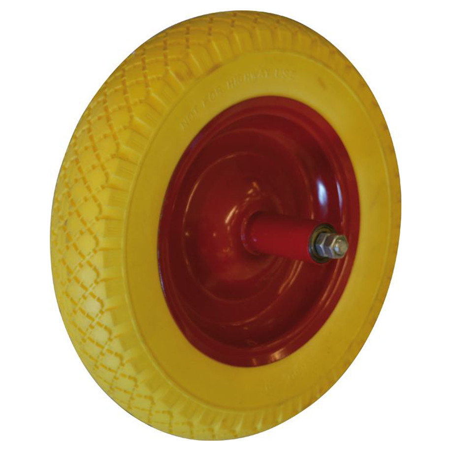 Ruota piena per carriola – Copertone giallo – Fulcro in metallo – Monta su carriole con interasse 150 mm.